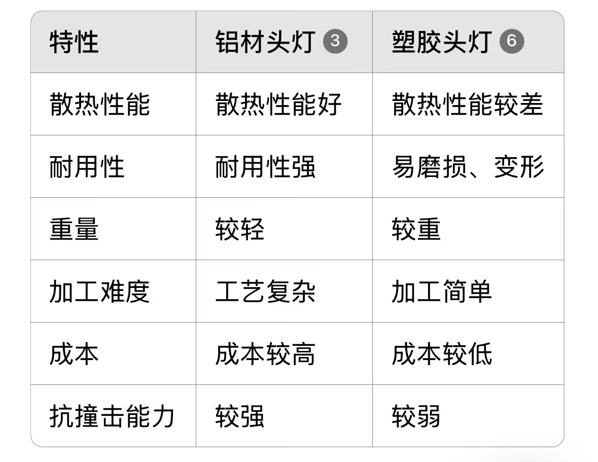 ● 铝材头灯由于材质和工艺的原因,成本较高。
